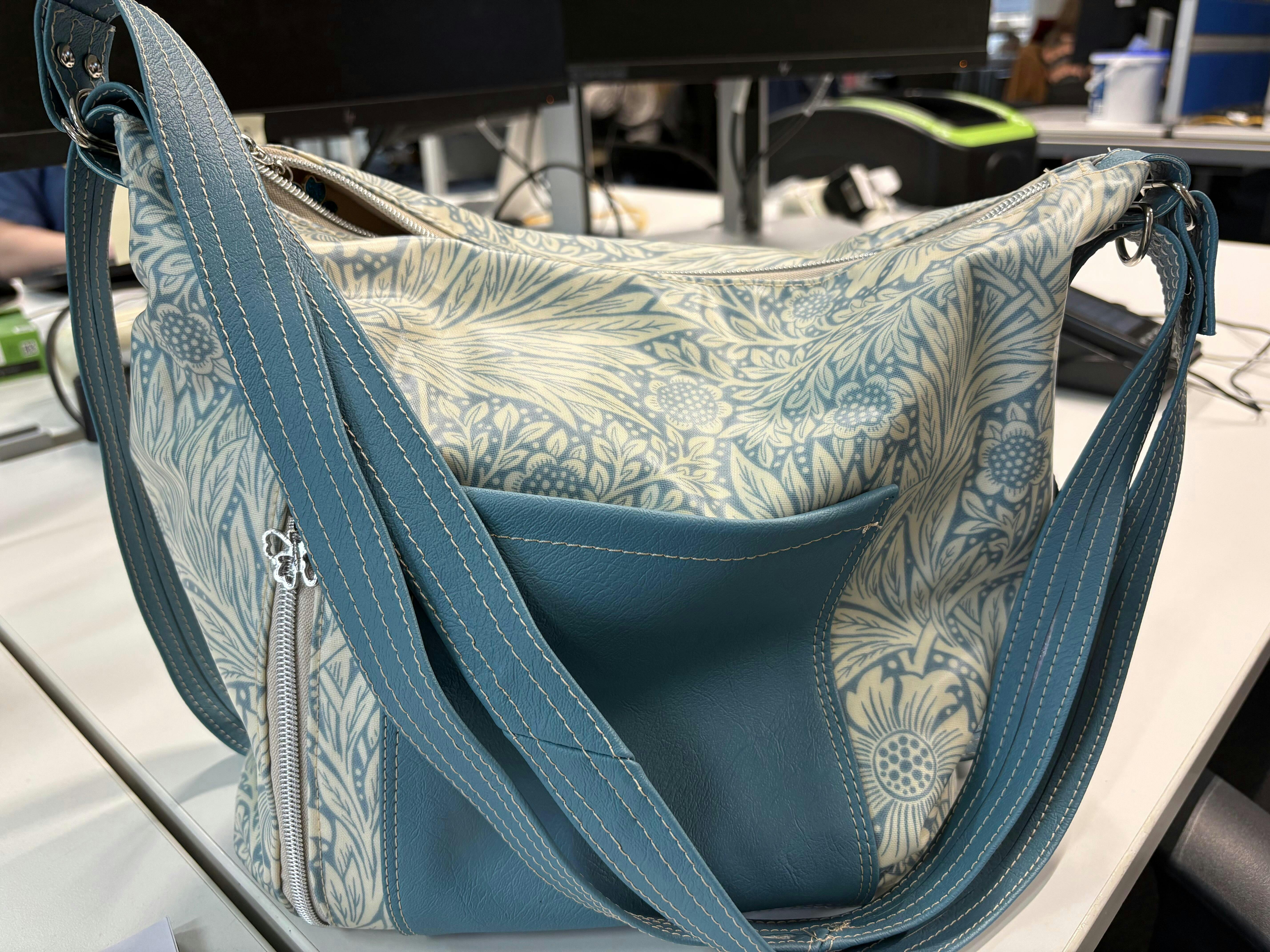 Specs: Finished bag is approximately 11” wide along the bottom oval base and 14" across the top. It is by 12” tall by 6” deep. It has 1 exterior slip pocket as well as a zipper pocket, 2 interior slip pockets on one side, and 1 interior zipper pocket on the opposite side.