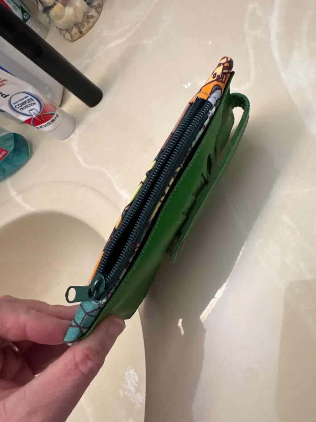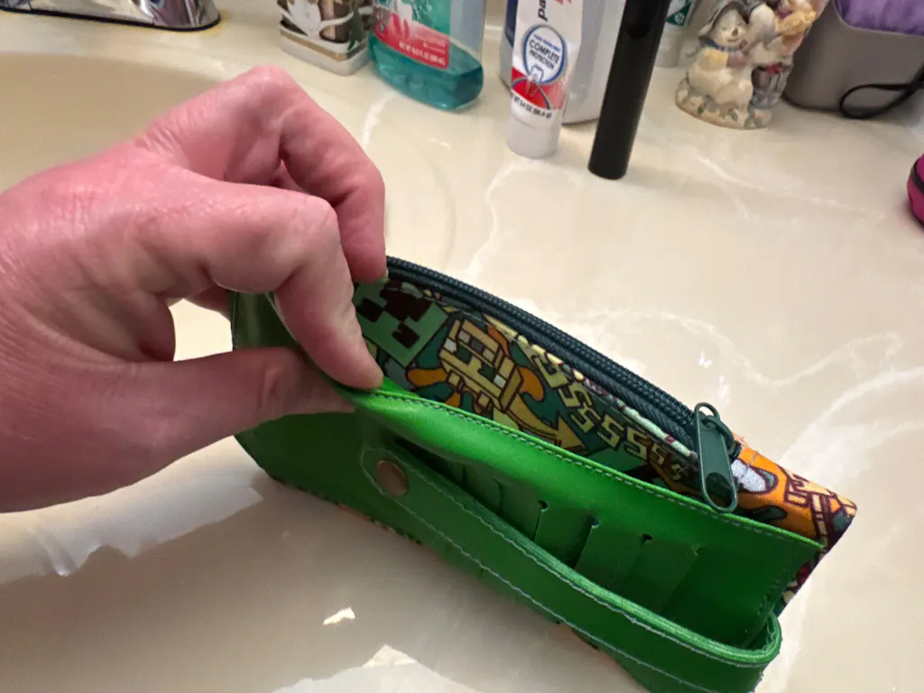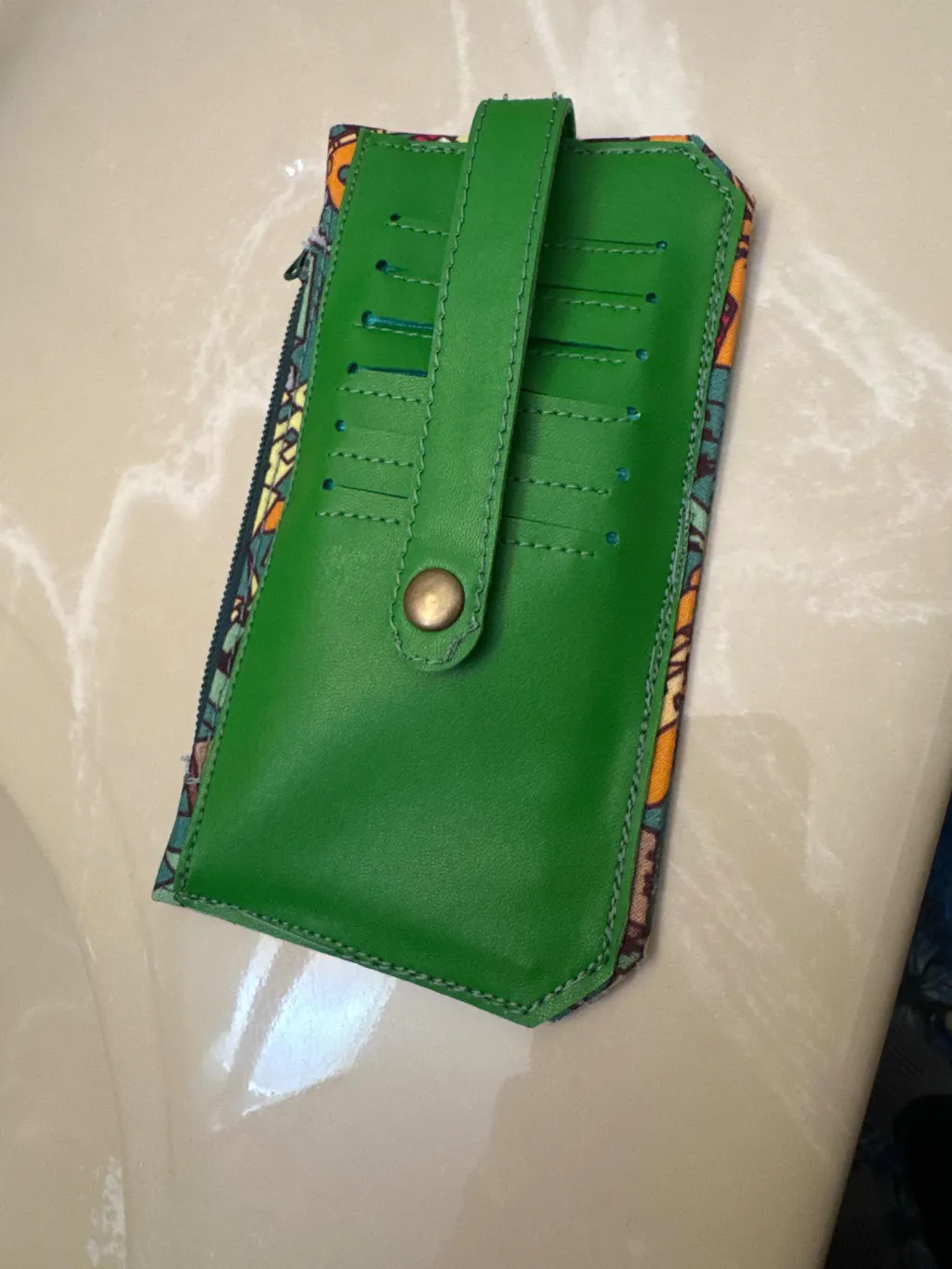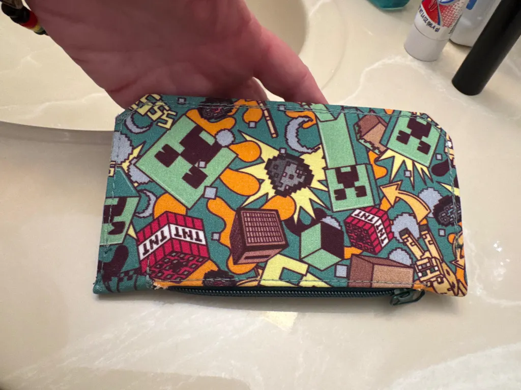 Specs: Finished wallet is approximately 4” wide by 7” tall, has 6 recessed card slots, (with a closure tab to keep them secure), a long slip pocket, and a lined zippered main compartment.