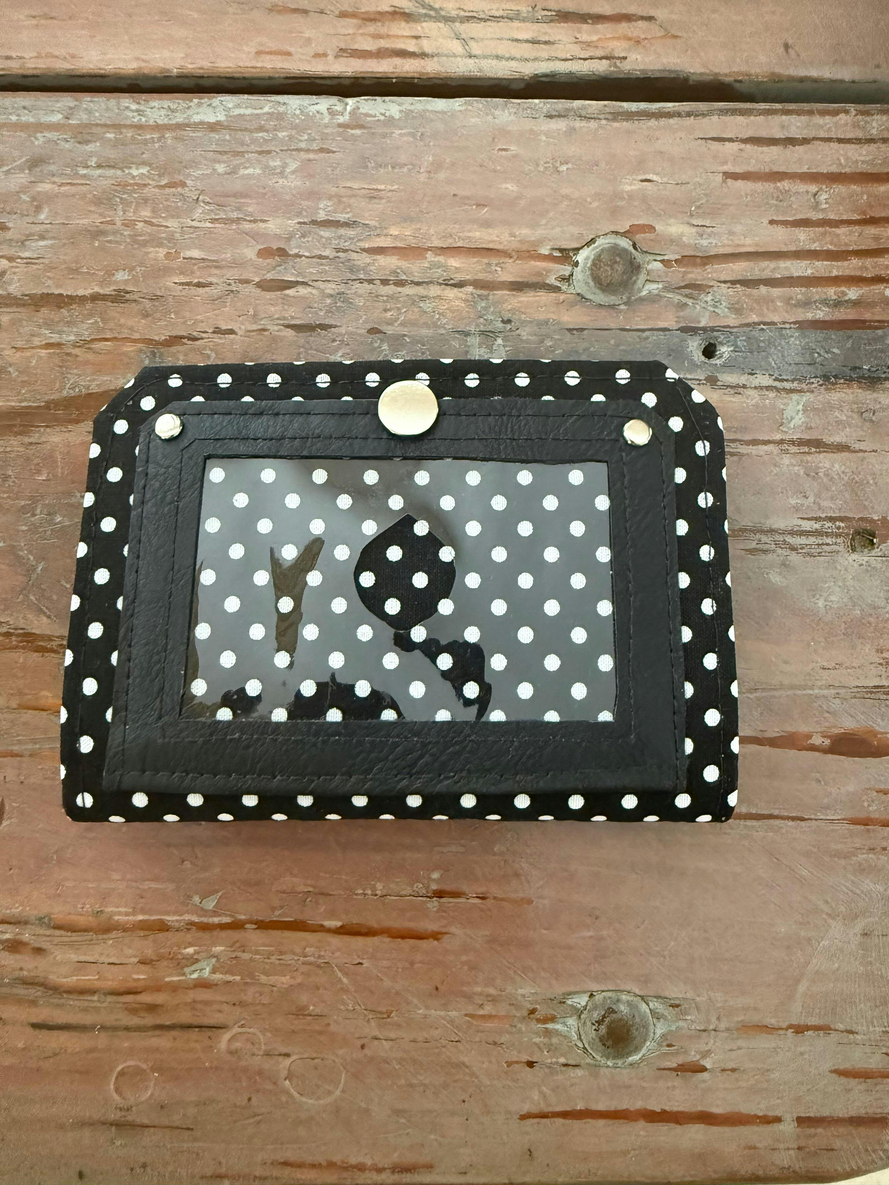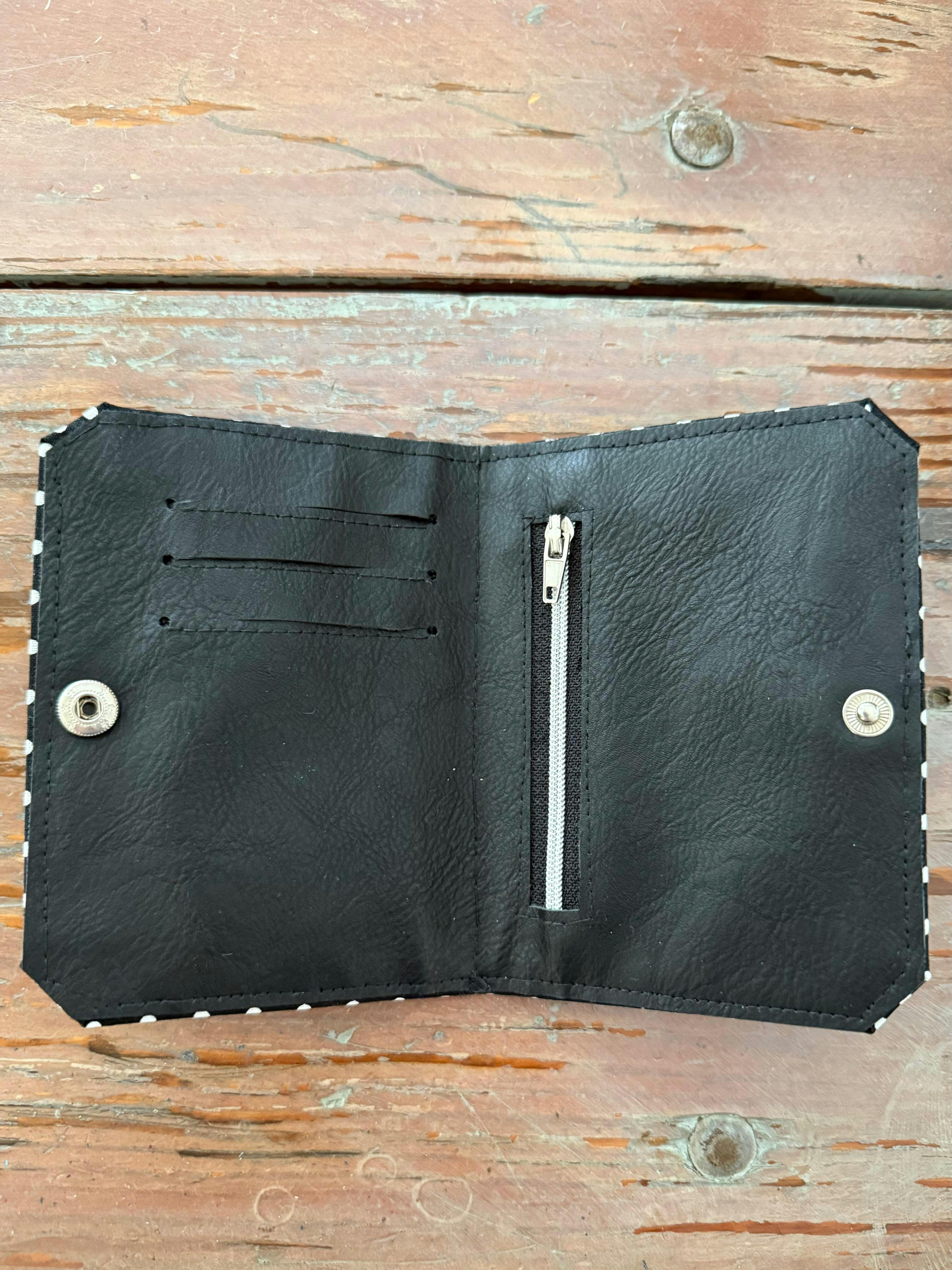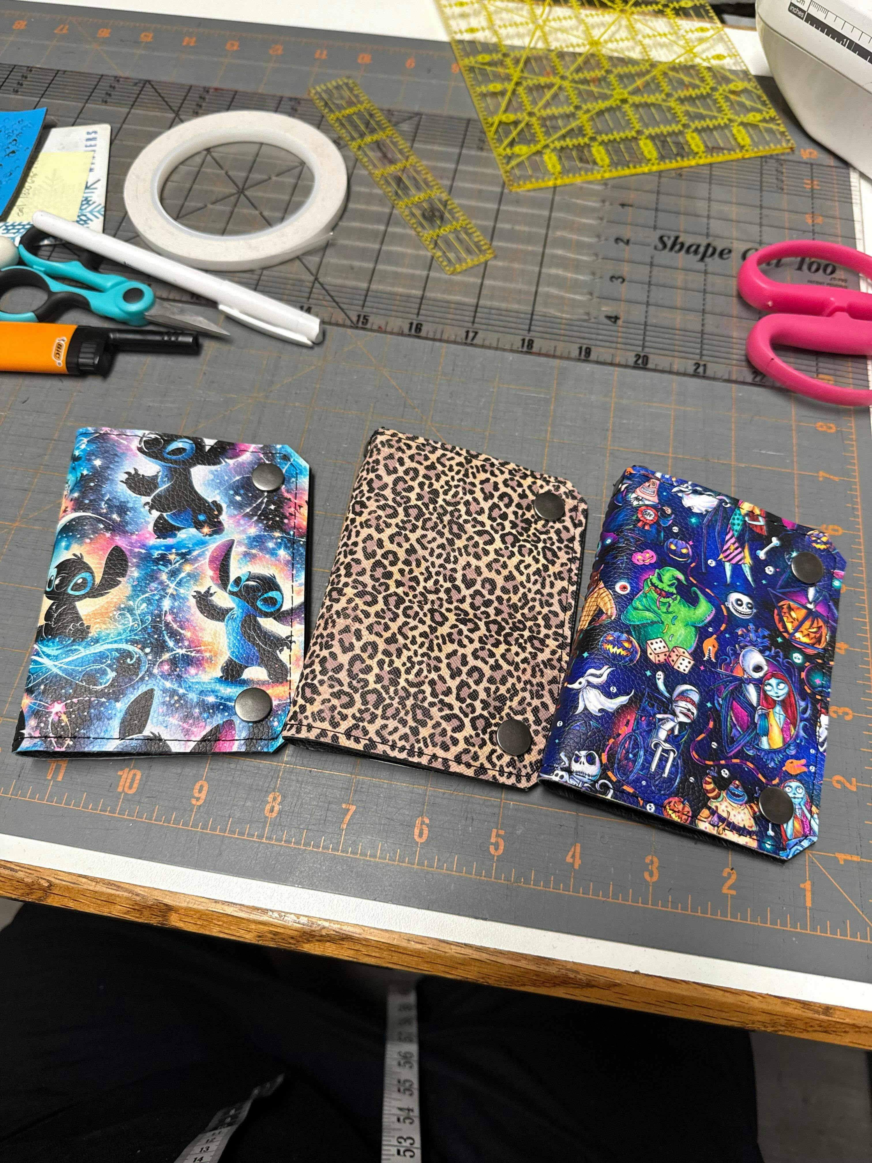 Specs: Finished wallet is approximately 3 1/2” wide by 5” tall (when folded shut), has 3 recessed card slots, a zippered coin pocket and an exterior ID window.