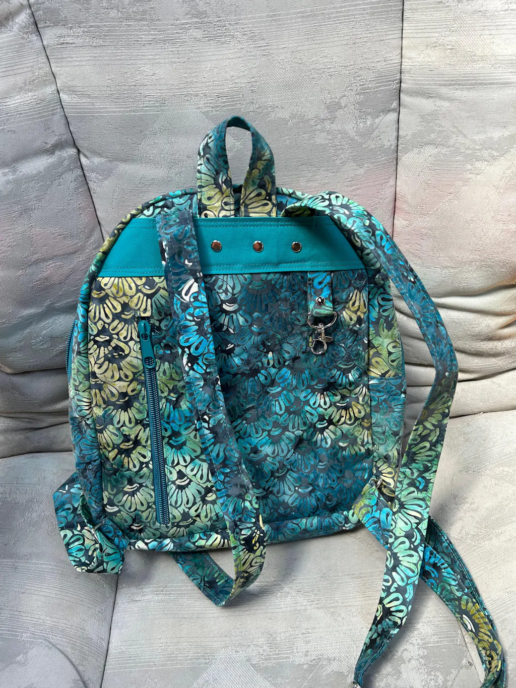 Specs: approximately 10” wide by 3” deep and 12” tall. Straps are cut 40” long and fully adjustable with a convenient grab handle along the top. It features a front 3 D pocket with 2 pen pockets and a larger slip pocket and has a large back exterior zipper pocket and optional key clip. Inside has a slip pocket. This pattern uses binding on the final finishes on the interior of the bag.