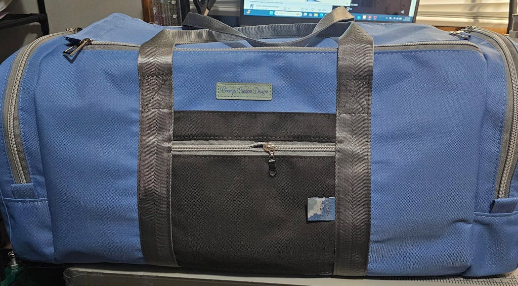 Specs: approximately 22” wide by 10” deep and 10” tall. It features a dual zippered main closure, 2 exterior end zippered pockets, 1 exterior slip/zipper pocket, and an optional dedicated shoe compartment. Instructions for a removable crossbody strap are included.